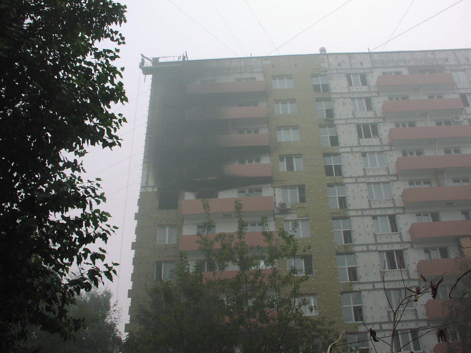 Дом 12-ти этажный, наша квартира на 9-м. Загорелось на 8-м, в соседней квартире, на фото видно... какой-то пьяный придурок уснул с сигаретой. Его маманя прибежала к нам, мы ее приютили, он тоже прибежал, совершенно голый, я его отправил вниз... и еще кое-куда. Мы стали собирать документы, а когда попытались выйти в подъезд, дышать там было уже невозможно, валил черный дым, горячий.