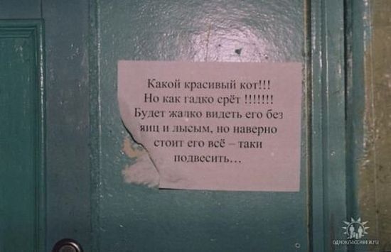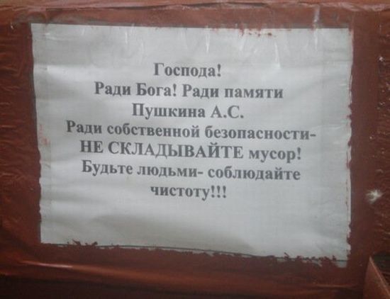 а я видела где-то лет пять назад на Чистых прудах растяжку над дорогой "жилой жомплекс" :D Мы с подругой даже сфотали, но фотка была на пленочный фотоаппарат да и то затерялась куда-то. А где-то через день я опять там проходила, и надпись уже поправили - лишние палочки краской закрасили.