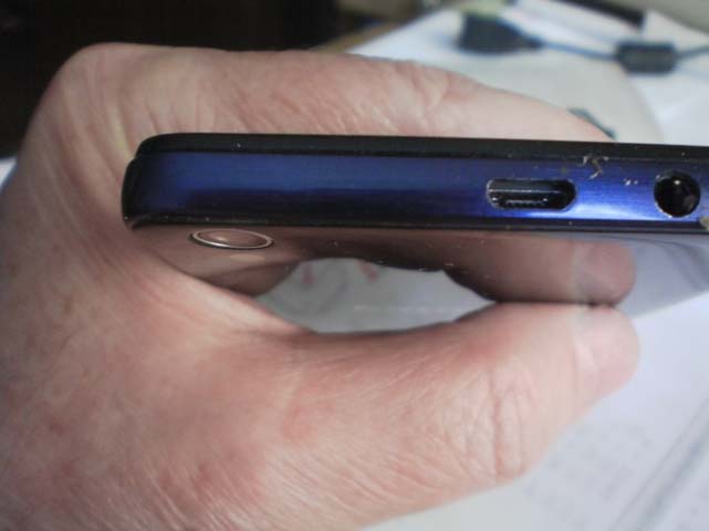 4. Здесь гнездо смартфона, куда подключить узкий разъём кабеля.Аккуратно следите за совпадением форм гнезда и разъёма. У каждого есть округлая сторона. Они должны совпасть.