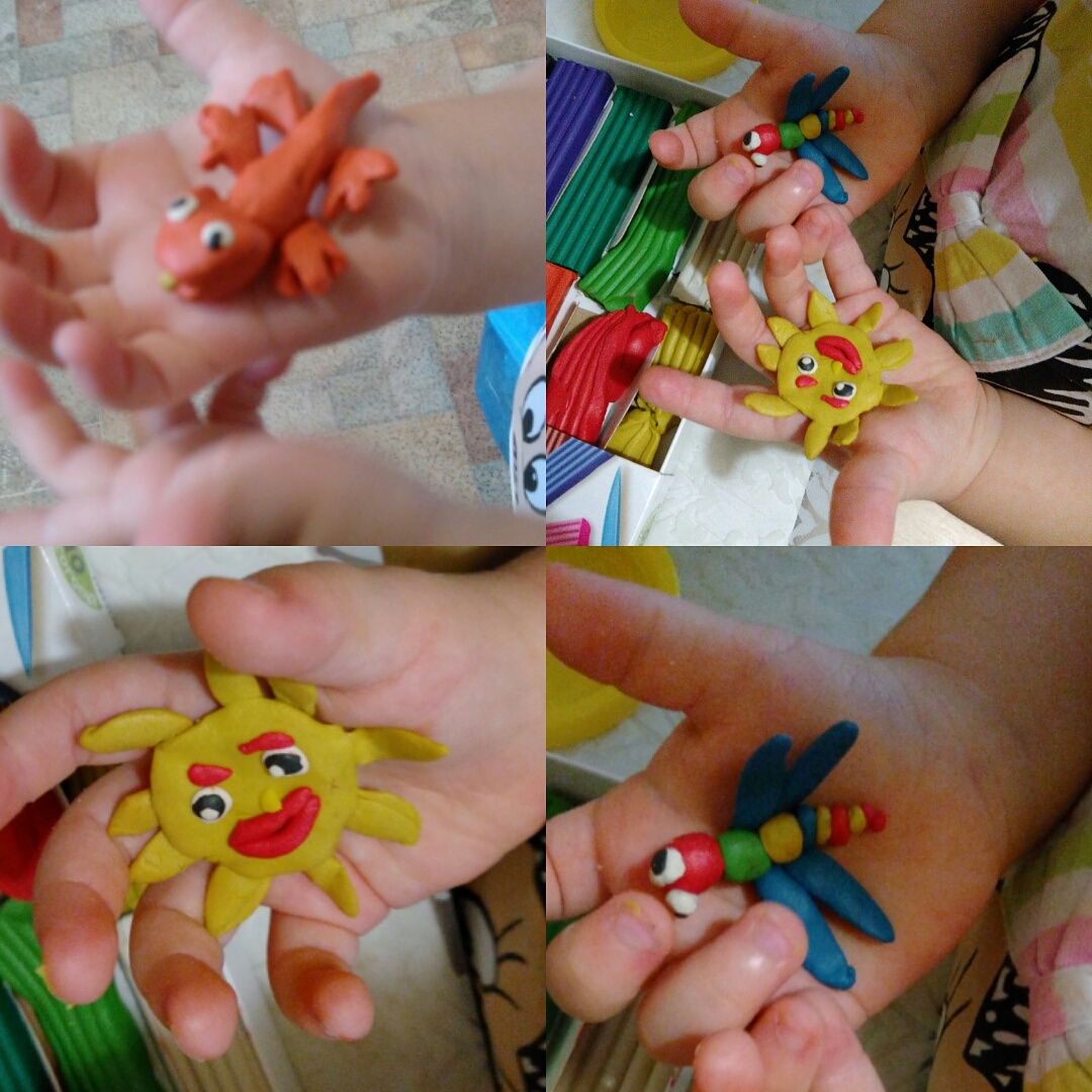 Ой, Танюш,ввела всех в заблуждение. Конечно, Варюша ещё так не лепит. Мы начинаем. Она прилепляет.) Лучики, глазки, губки.