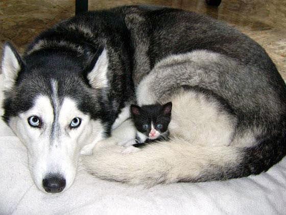Эти собаки просто чудо!а хаскенок-чудошко!А к собачке с котенком лучше не подходить! :D