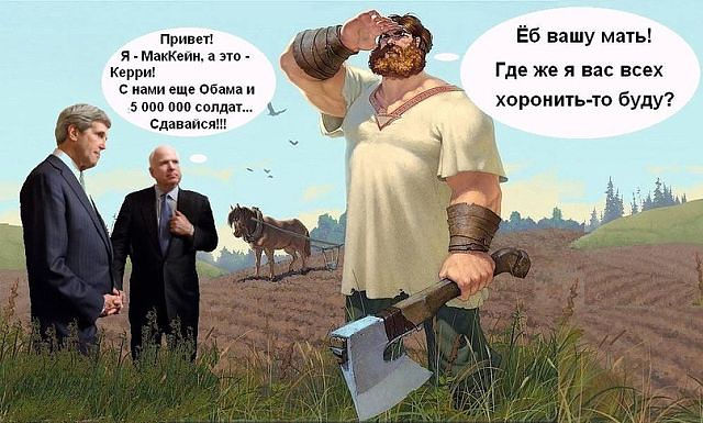 Сидят три богатыря, отдыхают, выпивают. Тут заходит Джим Керри - русские, сдавайтесь, нас пять миллионов, мы пришли вас убивать.